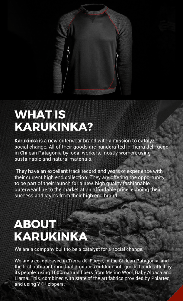 What we offer: We offer KARUKINKA – Ethical, Sustainable and Luxurious Outwear Handcrafted in Patagonia. These are very similar to the sweaters your mother used to make when you were little. These are the same kind of sweaters which filled you with the warmth of your mother’s love. We offer comfort, love and uniquity in our products. Our five keywords are Tribute, Fashion, function, durability and handcraft. We live and work under these five keywords.