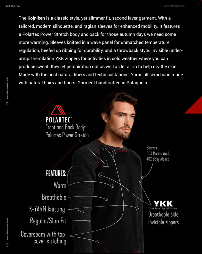 We have just launched our new product Kojniken Sweater. It is made with Polartec power stretch, 40% baby alpaca wool, 60% Marino wool. It has a side zipper to let the skin dry whenever you get sweaty and an upcycled leather tag. It comes only in black and will be customised to your fit after purchasing the product.